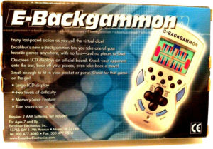 E Backgammon Publisher: ExcaliburModel: E BackgammonType: LCDRelease Year: –Made in: –Battery Type: 2xAAA Box Front Box Back Next Previous